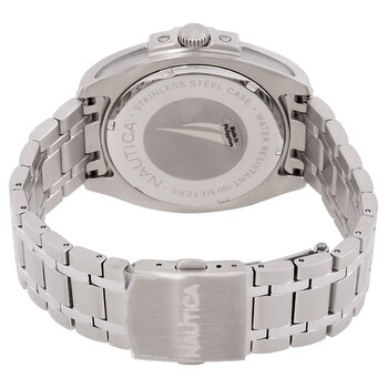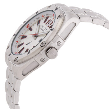Silver-tone stainless steel case and bracelet. Fixed silver-tone stainless steel bezel. White dial with silver-tone hands and index-Arabic numeral hour markers. Minute markers around the outer rim. Dial Type: Analog. Date display at the 3 o'clock position. Quartz movement. Scratch resistant mineral crystal. Solid case back. Round case shape, case size: 44 mm, case thickness: 11 mm. Band width: 22 mm. Deployment with push button release clasp. Water resistant at 100 meters / 330 feet. Functions: date, hour, minute, second. Tin Can Bay Series. Casual watch style. Watch label: Japan Movt. Nautica Tin Can Bay White Dial Men's Watch NAPTCS221.
