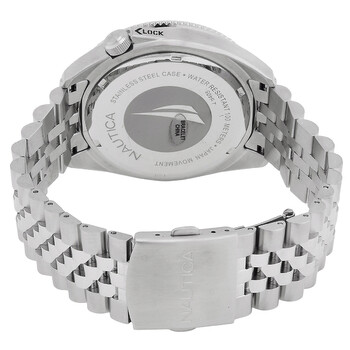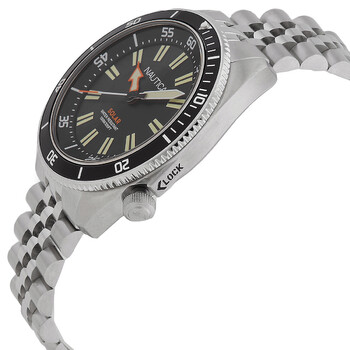 Silver-tone stainless steel case and bracelet. Black stainless steel bezel. Black dial with white;orange hands and index hour markers. Minute markers around the outer rim. Dial Type: Analog. Luminescent hands and markers. Eco-drive movement. Scratch resistant mineral crystal. Solid case back. Round case shape, case size: 44 mm. Deployment with push button release clasp. Water resistant at 100 meters / 330 feet. Functions: hour, minute, second. Vintage Series. Sport watch style. Watch label: Japan Movt. Nautica Vintage Black Dial Men's Watch NAPNVS405.