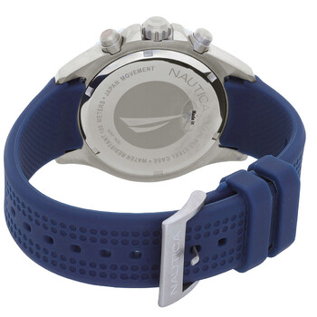 Silver-tone stainless steel case with a blue stainless steel bracelet. Blue stainless steel bezel. Blue dial with silver-tone hands and index-flag hour markers. Minute markers around the outer rim. Dial Type: Analog. Luminescent hands and markers. Date display between 4 and 5 o'clock position. Chronograph - three sub-dials displaying: 60 second, 30 minute and 24 hour. Quartz movement. Scratch resistant mineral crystal. Solid case back. Round case shape, case size: 44 mm. Fold over clasp with a safety release. Water resistant at 100 meters / 330 feet. Functions: chronograph, date, hour, minute, second. Westport Series. Sport watch style. Nautica Westport Chronograph Quartz Blue Dial Men's Watch NAPWPS302.