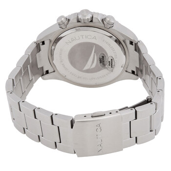 Silver-tone stainless steel case and bracelet. Blue stainless steel bezel. Blue dial with silver-tone hands and index-flag hour markers. Minute markers around the outer rim. Dial Type: Analog. Luminescent hands and markers. Date display between 4 and 5 o'clock position. Chronograph - three sub-dials displaying: 60 second, 30 minute and 24 hour. Quartz movement. Scratch resistant mineral crystal. Solid case back. Round case shape, case size: 44 mm. Fold over clasp with a safety release. Water resistant at 100 meters / 330 feet. Functions: chronograph, date, hour, minute, second. Westport Series. Sport watch style. Nautica Westport Chronograph Quartz Blue Dial Men's Watch NAPWPS304.