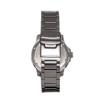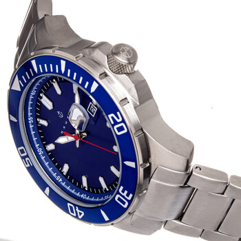 Band Color: Silver Stainless Steel; Band Width: 22mm near case; 20mm near clasp/buckle; Bezel Color: Blue; Case: Silver + Circle-Shaped; Case Finish: Brushed + Stainless Steel; Case Thickness: 14mm; Case Width: 45mm; 50mm with Crown; Clasp / Buckle: Fold Over Push Button Deployment; Dial: Blue + Analog; Hand Color: Silver; Movement: Japanese + Quartz; Time Zones: Single; Water Resistance: 20 ATM. Silver-tone stainless steel case and bracelet. Uni-directional rotating blue stainless steel bezel. Blue dial with silver-tone hands and index hour markers. Minute markers around the outer rim. Dial Type: Analog. Luminescent hands and markers. Date display at the 3 o'clock position. Quartz movement. Scratch resistant mineral crystal. Pull / push crown. Solid case back. Round case shape, case size: 45 mm, case thickness: 14 mm. Band width: 22 mm, band length: 9.25 inches. Deployment with push button release clasp. Water resistant at 200 meters / 660 feet. Functions: date, hour, minute, second. Admiralty Pro 200 Series. Casual watch style. Watch label: Japan Movt. Nautis Admiralty Pro 200 Quartz Blue Dial Men's Watch GL2008-E.