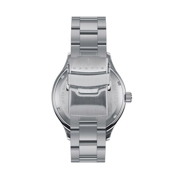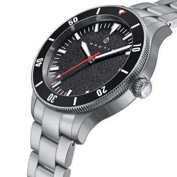 Band Color: Silver Stainless Steel; Band Width: 20mm near case; 18mm near clasp/buckle; Bezel Color: Black; Case: Silver + Circle-Shaped; Case Finish: Polished + Stainless Steel; Case Thickness: 12mm; Case Width: 43mm; 47mm with Crown; Clasp / Buckle: Fold Over Push Button Deployment; Dial: Black + Analog; Hand Color: Silver; Movement: Japanese + Quartz; Time Zones: Single; Water Resistance: 20 ATM.