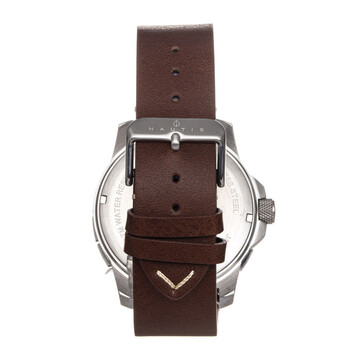 Band Color: Brown Genuine Leather; Band Width: 22mm near case; 20mm near clasp/buckle; Bezel Color: Blue; Case: Silver + Circle-Shaped; Case Finish: Brushed + Stainless Steel; Case Thickness: 14mm; Case Width: 45mm; 51mm with Crown; Clasp / Buckle: Strap Buckle; Dial: Blue + Analog; Hand Color: Silver; Movement: Japanese + Quartz; Time Zones: Single; Water Resistance: 20 ATM. Silver-tone stainless steel case with a brown genuine leather strap. Uni-directional rotating blue stainless steel bezel. Blue dial with silver-tone hands and index hour markers. Minute markers around the outer rim. Dial Type: Analog. Luminescent hands and markers. Date display at the 3 o'clock position. Quartz movement. Scratch resistant mineral crystal. Pull / push crown. Solid case back. Round case shape, case size: 45 mm, case thickness: 14 mm. Band width: 22 mm, band length: 9 inches. Buckle clasp. Water resistant at 200 meters / 660 feet. Functions: date, hour, minute, second. Dive Pro 200 Series. Casual watch style. Watch label: Japan Movt. Nautis Dive Pro 200 Quartz Blue Dial Men's Watch GL1909-E.