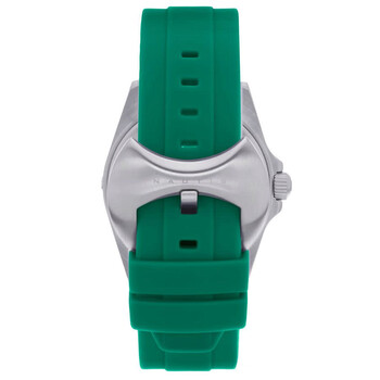 Band Color: Green Rubber; Band Width: 22mm near case; 22mm near clasp/buckle; Bezel Color: Green & Purple; Case: Silver + Circle-Shaped; Case Finish: Brushed + Stainless Steel; Case Thickness: 14mm; Case Width: 43mm; 47mm with Crown; Clasp / Buckle: Strap Buckle; Dial: Green + Analog; Hand Color: Silver; Movement: Swiss + Quartz; Time Zones: Single; Water Resistance: 50 ATM.