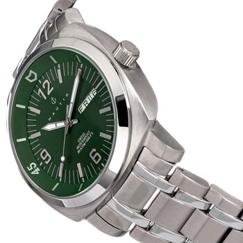 Stainless steel case with a stainless steel bracelet. Fixed stainless steel bezel. Green dial with luminous silver-tone hands and index hour markers. Arabic numerals appear at the 6, 9 and 12 o'clock positions. Minute markers around the outer rim. Dial Type: Analog. Luminescent hands. Day of the week and date display at the 3 o'clock position. Quartz movement. Scratch resistant mineral crystal. Pull / push crown. Solid case back. Case size: 45 mm. Case thickness: 15 mm. Band width: 24 mm. Band length: 9 inches. Deployment clasp with a push button release. Water resistant at 200 meters / 660 feet. Functions: date, day, hour, minute, second. Stealth Series. Casual watch style. Watch label: Swiss Made. Nautis Stealth Quartz Green Dial Men's Watch GL2087-A.