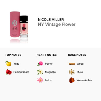 Nicole Miller NY Vintage Flower opens with a refreshing splash of yuzu and juicy pomegranate, giving it an energetic and crisp beginning. At its heart, a delicate bouquet blooms—featuring soft peony, graceful magnolia, and serene lotus flowers. These floral notes create a gentle, feminine aura that feels both modern and classic.