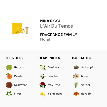 L'Air Du Temps opens with a fresh and romantic bouquet of top notes, including bergamot, peach, rosewood, neroli, rose centifolia, and spicy carnation. These delicate notes create an inviting, feminine aura that draws you in with charm and warmth.
