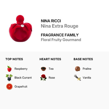 Experience the allure of Nina Ricci Nina Extra Rouge and let its enchanting blend of fruity, floral, and gourmand notes awaken your senses.