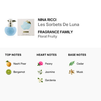 Les Sorbets De Luna opens with a juicy burst of nashi pear and the zesty sparkle of bergamot, setting a playful and invigorating tone. At its heart, delicate petals of peony, jasmine, and gardenia bloom beautifully, adding a soft, feminine allure. The fragrance settles into a comforting base of cedar and musk, offering a warm, elegant finish that lingers gently on the skin.