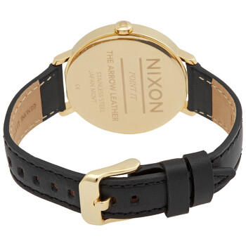 Gold-tone stainless steel case with a black leather strap. Fixed gold-tone bezel. Black dial with black hands and Arabic numeral hour markers. Index markers appear at the 3, 6, 9 and 12 o'clock positions. Dial Type: Analog. Quartz movement. Scratch resistant mineral crystal. Pull / push crown. Solid case back. Round case shape. Case size: 37 mm. Case thickness: 9 mm. Band width: 16 mm. Band length: 7 inches. Tang clasp. Water resistant at 100 meters / 330 feet. Functions: hour, minute, second. Arrow Leather Series. Watch label: Japan Movt. Nixon Arrow Leather Quartz Black Leather Ladies Watch A1091-2879.