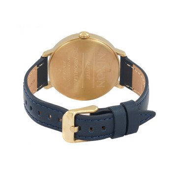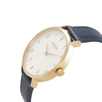 Yellow gold-tone stainless steel case with a blue leather strap. Fixed yellow gold-tone bezel. Grey dial with yellow gold-tone hands and Arabic numeral hour markers. Index markers at the 3, 6, 9 and 12 o'clock positions. Dial Type: Analog. Quartz movement. Scratch resistant mineral crystal. Pull / push crown. Solid case back. Round case shape. Case size: 38 mm. Case thickness: 7 mm. Strap width: 17.5 mm. Tang clasp. Water resistant at 50 meters / 165 feet. Functions: hour, minute, second. Arrow Series. Luxury watch style. Nixon Arrow Quartz Grey Dial Blue Leather Ladies Watch A1091-151-00.