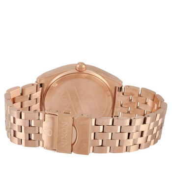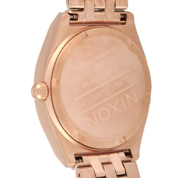 Rose gold-tone stainless steel case and bracelet. Fixed rose gold-tone bezel. Silver dial with luminous rose gold-tone hands and index hour markers. Arabic numeral minute markers (at 5 minute intervals). Minute markers around the outer rim. Dial Type: Analog. Luminescent hands and markers. Quartz movement. Scratch resistant mineral crystal. Pull / push crown. Solid case back. Round case shape. Case size: 39 mm. Fold over clasp with a safety release. Water resistant at 100 meters / 330 feet. Functions: hour, minute, second. Crew Series. Luxury watch style. Nixon Crew Quartz Silver Dial Ladies Watch A1186-2761-00.