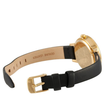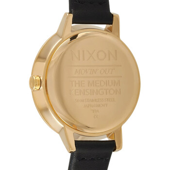 Yellow gold-tone stainless steel case with a black leather strap. Fixed yellow gold-tone bezel. Black dial with yellow gold-tone hands and index hour markers. Dial Type: Analog. Quartz movement. Scratch resistant mineral crystal. Pull / push crown. Solid case back. Round case shape. Case size: 32 mm. Band width: 12 mm. Tang clasp. Water resistant at 50 meters / 165 feet. Functions: hour, minute, second. Kensignton Series. Dress watch style. Nixon Kensignton Quartz Black Dial Ladies Watch A1261-513-00.