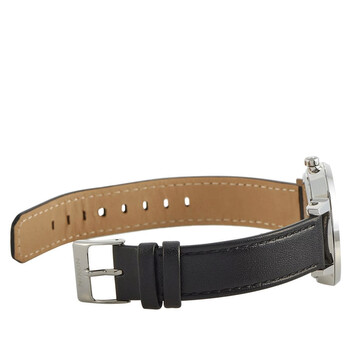 Stainless steel case with a black leather strap. Fixed stainless steel bezel. Black dial with silver-tone hands and index hour markers. Dial Type: Analog. Quartz movement. Scratch resistant mineral crystal. Pull / push crown. Solid case back. Round case shape. Case size: 37 mm. Tang clasp. Water resistant at 50 meters / 165 feet. Kensington Series. Luxury watch style. Nixon Kensington Quartz Black Dial Ladies Watch A108-000-00.