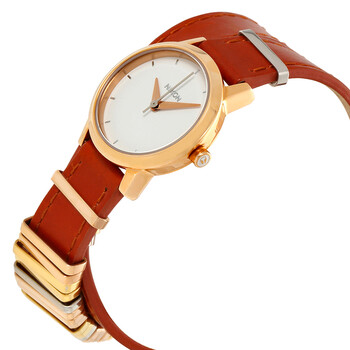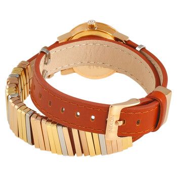 Rose gold-tone stainless steel case with a brown and rose gold-tone leather with stainless steel strap. Fixed rose gold-tone stainless steel bezel. White dial with rose gold-tone hands and index hour markers. Dial Type: Analog. Quartz movement. Scratch resistant mineral crystal. Pull / push crown. Solid case back. Case size: 26 mm. Case thickness: 8 mm. Round case shape. Band width: 13 mm. Water resistant at 50 meters / 165 feet. Functions: hour, minute, second. Additional Info: in general, suitable for short periods of recreational swimming, but not diving or snorkeling. Casual watch style. Nixon Kenzi White Dial Wrap Leather Ladies Watch A4031749.