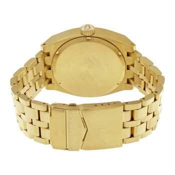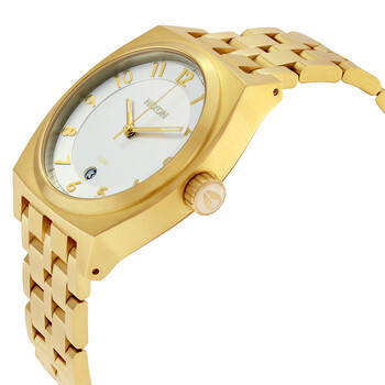 Champagne gold stainless steel case with a champagne gold stainless steel bracelet. Fixed gold-tone bezel. Silver dial with gold-tone hands and index hour markers. Dial Type: Analog. Date display at the 6 o'clock position. Quartz movement. Scratch resistant mineral crystal. Pull / push triple gasket crown. Solid case back. Round case shape, case size: 40 mm, case thickness: 12 mm. Band width: 20 mm. Deployment clasp. Water resistant at 100 meters / 330 feet. Functions: date, hour, minute, second. Casual watch style. Nixon Monopoly Men's Watch A3251219.