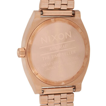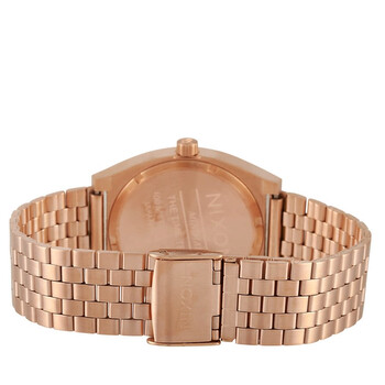 Rose gold-tone stainless steel case and bracelet. Fixed rose gold-tone bezel. Black dial with rose gold-tone hands and index hour markers. Dial Type: Analog. Quartz movement. Scratch resistant mineral crystal. Pull / push crown. Solid case back. Tonneau case shape. Case size: 38 mm. Case thickness: 9 mm. Fold over slip through clasp. Water resistant at 100 meters / 330 feet. Functions: hour, minute, second. Time Teller Series. Luxury watch style. Nixon Nixon Multi-Color Dial Ladies Watch A045-2598-00.