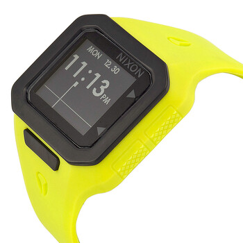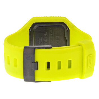 Yellow polyurethane case with a yellow silicone strap. Fixed black polyurethane bezel. Black digital dial displaying: hour, minute, am/pm, day of the week, date and tide. Dial Type: Analog. Quartz movement. Scratch resistant mineral crystal. Solid case back. Case diameter: 45 mm. Case thickness: 10 mm. Rectangle case shape. Band width: 22 mm. Tang clasp. Water resistant at 100 meters / 330 feet. Functions: hour, minute, pre-programmed tide information for over 230 beaches, 48 hour future tide, heat timer, alarm and light functions. Casual watch style. Nixon Supertide Black Dial Silicone Strap Men's Watch A316-1262.