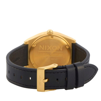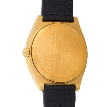 Yellow gold-tone stainless steel case with a black leather strap. Fixed yellow gold-tone stainless steel bezel. White dial with black hands and index hour markers. Minute markers around the outer rim. Dial Type: Analog. Luminescent hands. Quartz movement. Solid case back. Round case shape, case size: 39 mm. Buckle clasp. Water resistant at 100 meters / 330 feet. Functions: hour, minute, second. The Crew Series. Dress watch style. Nixon The Crew Quartz White Dial Men's Watch A1188-2769-00.