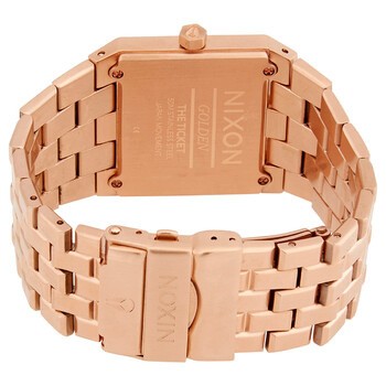 Rose gold-tone stainless steel case and bracelet. Fixed rose gold-tone bezel. Rose dial with rose gold-tone hands. Index markers at the 3, 6, 9 and 12 o'clock positions. Dial Type: Analog. Quartz movement. Scratch resistant mineral crystal. Pull / push crown. Solid case back. Rectangle case shape. Case size: 34 mm. Case thickness: 8 mm. Band width: 23 mm. Fold over clasp with a push button release. Water resistant at 50 meters / 165 feet. Ticket II All Rose Gold Series. Luxury watch style. Nixon Ticket II All Rose Gold Quartz Men's Watch A1262-897-00.