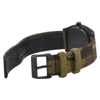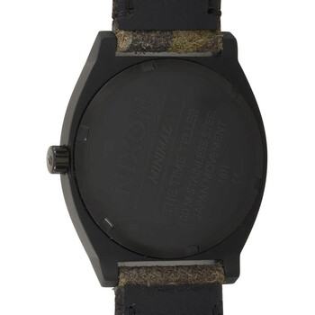 Black-plated stainless steel case with a black camo leather strap. Fixed black-plated bezel. Black dial with black hands and index hour markers. Dial Type: Analog. Quartz movement. Scratch resistant mineral crystal. Pull / push crown. Solid case back. Tonneau case shape. Case size: 37 mm. Tang clasp. Water resistant at 100 meters / 330 feet. Functions: date, hour, minute, second. Time Teller Series. Luxury watch style. Nixon Time Teller Quartz Black Dial Men's Watch A045-3054-00.