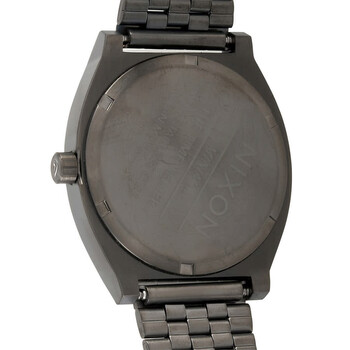 Grey-plated stainless steel case and bracelet. Fixed grey-plated bezel. Grey dial with silver-tone hands. Dot markers appear at the 3, 6, 9 and 12 o'clock positions. Minute markers around the outer rim. Dial Type: Analog. Quartz movement. Scratch resistant mineral crystal. Screw down crown. Solid case back. Tonneau case shape. Case size: 37 mm. Case thickness: 10 mm. Fold over slip through clasp. Water resistant at 100 meters / 330 feet. Functions: hour, minute, second. Time Teller Series. Luxury watch style. Nixon Time Teller Quartz Grey Dial Men's Watch A045-2947-00.