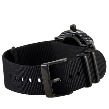 Black acetate case with a black canvas strap. Fixed black acetate bezel. Silver dial with black hands and index hour markers. Dial Type: Analog. Quartz movement. Scratch resistant mineral crystal. Pull / push crown. Solid case back. Round case shape. Case size: 40 mm. Case thickness: 6 mm. Band width: 20 mm. Tang clasp. Water resistant at 100 meters / 330 feet. Functions: hour, minute, second. Time Teller Series. Casual watch style. Nixon Time Teller Quartz Silver Dial Ladies Watch A327-2345-00.