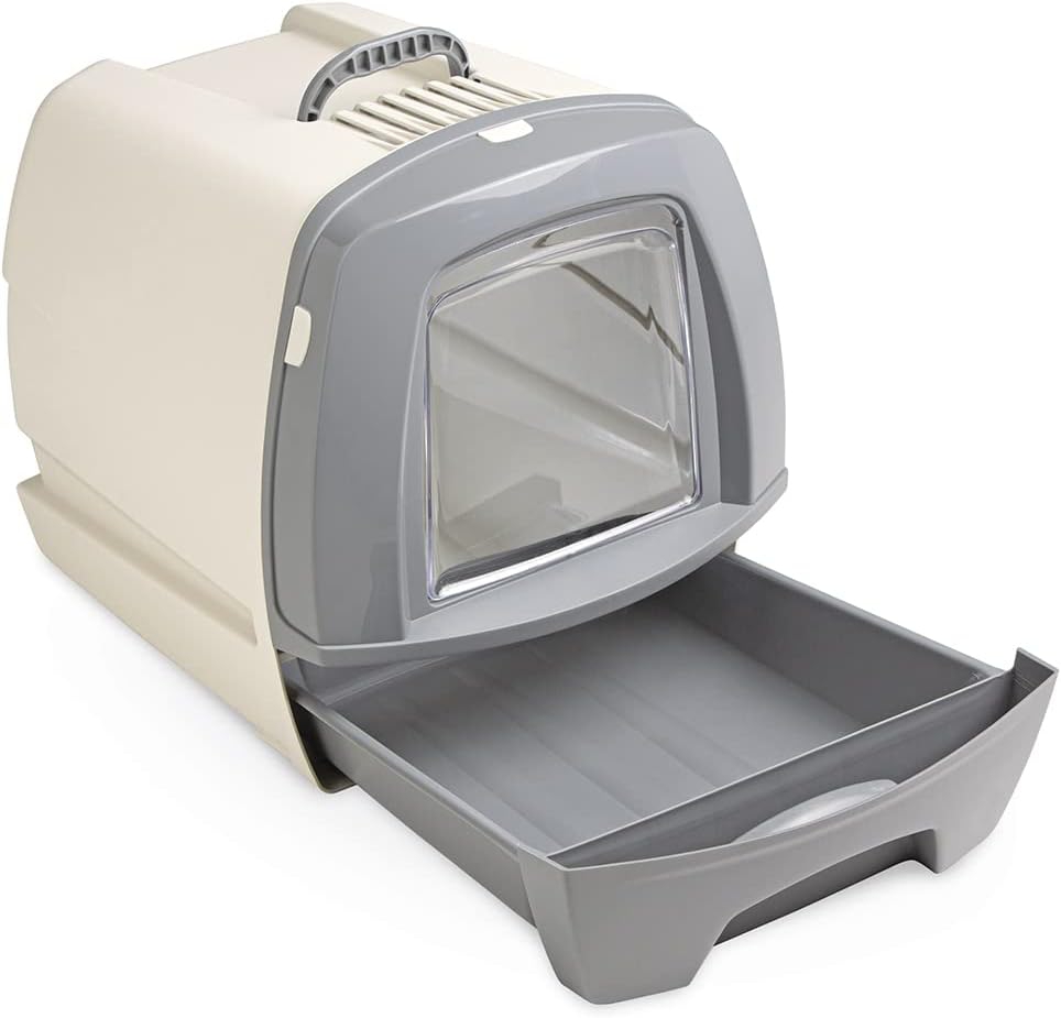 დიზაინი: კატის ტუალეტს აქვს ჩაშენებული უჯრა. ასევე სახელური მარტივი გადაადგილებისთვის.