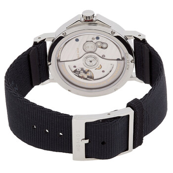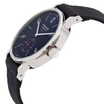 Silver-tone stainless steel case with a blue-black textile strap. Fixed silver-tone stainless steel bezel. Atlantic blue dial with rhodium-plated hands and index-Arabic numeral hour markers. Minute markers around the outer rim. Dial Type: Analog. Date display at the 3 o'clock position. One subdial displaying: small second. Nomos Calibre DUW 6101 Automatic movement, containing 27 Jewels, bitting at 21600 vph, and has a power reserve of approximately 42 hours. Scratch resistant sapphire crystal. Screw down crown. Transparent case back. Round case shape, case size: 38.5 mm, case thickness: 9.9 mm. Water resistant at 200 meters / 660 feet. Functions: date, hour, minute, small second. Ahoi Neomatik Series. Luxury watch style. Watch label: Made in Germany. Nomos Ahoi Neomatik Automatic Atlantic Blue Dial Watch 528.