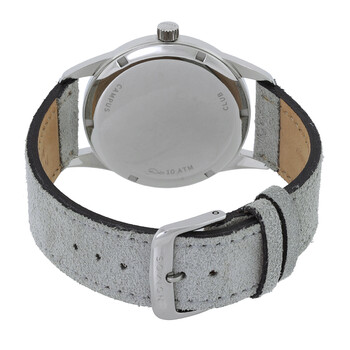 Silver-tone stainless steel case with a grey velour leather strap. Fixed silver-tone stainless steel bezel. Cream coral dial with rhodium-plated hands and index-Arabic numeral hour markers. Minute markers around the outer rim. Dial Type: Analog. Luminescent hands and markers. One subdial displaying: small second. Nomos Calibre Alpha Hand Wind movement, containing 17 Jewels, bitting at 21600 vph, and has a power reserve of approximately 43 hours. Scratch resistant sapphire crystal. Solid case back. Round case shape, case size: 38.5 mm, case thickness: 8.5 mm. Band width: 20 mm. Tang clasp. Water resistant at 100 meters / 330 feet. Functions: hour, minute, small second. Club Campus Series. Luxury watch style. Watch label: Made in Germany. Nomos Club Campus Hand Wind Cream Coral Dial Men's Watch 725.