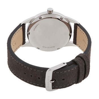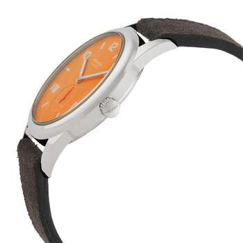 Silver-tone stainless steel case with a anthracite velour leather strap. Fixed silver-tone stainless steel bezel. Orange dial with rhodium-plated and neon orange hands. Arabic numeral-index hour markers. Arabic numeral minute markers (at 5 minute intervals). Dial Type: Analog. Luminescent hands and markers. One subdial displaying: small second. Nomos Calibre Alpha Hand Wind movement, containing 17 Jewels, bitting at 21600 vph, and has a power reserve of approximately 43 hours. Scratch resistant sapphire crystal. Solid case back. Round case shape, case size: 38.5 mm, case thickness: 8.5 mm. Band width: 20 mm. Tang clasp. Water resistant at 100 meters / 330 feet. Functions: hour, minute, small second. Club Campus 38 Series. Casual watch style. Watch label: Made in Germany. Nomos Club Campus 38 Future Orange Hand Wind Men's Watch 729.