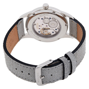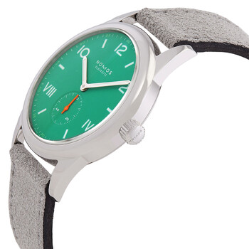 Silver-tone stainless steel case with a gray leather strap. Fixed silver-tone stainless steel bezel. Green dial with silver-tone hands and index-Arabic numeral hour markers. Arabic numeral minute markers (at 5 minute intervals). Dial Type: Analog. Luminescent hands and markers. One subdial displaying: small second. Nomos Calibre Alpha Hand Wind movement, containing 17 Jewels, bitting at 21600 vph, and has a power reserve of approximately 43 hours. Scratch resistant sapphire crystal. Pull / push crown. Transparent case back. Round case shape, case size: 38.5 mm, case thickness: 8.5 mm. Band width: 20 mm. Tang clasp. Water resistant at 100 meters / 330 feet. Functions: hour, minute, small second. Club Campus 38 Series. Luxury watch style. Watch label: Made in Germany. Nomos Club Campus 38 Hand Wind Green Dial Men's Watch 726.GB.