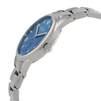 Silver-tone stainless steel case and bracelet. Fixed silver-tone stainless steel bezel. Polar blue dial with rhodium-plated hands and index-Arabic numeral hour markers. Arabic numeral minute markers (at 5 minute intervals). Dial Type: Analog. Luminescent hands and markers. One subdial displaying: small second. Nomos Calibre DUW 3001 Automatic movement, containing 27 Jewels, bitting at 21600 vph, and has a power reserve of approximately 42 hours. Scratch resistant sapphire crystal. Screw down crown. Transparent case back. Round case shape, case size: 37 mm, case thickness: 8.4 mm. Band width: 18 mm. Fold over clasp with a safety release. Water resistant at 200 meters / 660 feet. Functions: hour, minute, small second. Club Sport Neomatik Series. Sport watch style. Watch label: Made in Germany. Nomos Club Sport Neomatik Automatic Polar Blue Dial Men's Watch 750.