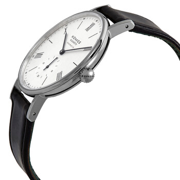 Stainless steel case with a black leather strap. Fixed stainless steel bezel. White dial with blue hands and alternating Roman numeral and index hour markers. Minute markers around the outer rim. Dial Type: Analog. Small seconds sub-dial. Nomos calibre DUW 3001 automatic movement, containing 27 Jewels, bitting at 21600 vph, and has a power reserve of approximately 42 hours. Scratch resistant sapphire crystal. Pull / push crown. Transparent case back. Round case shape. Case size: 38.5 mm. Case thickness: 7 mm. Band width: 19 mm. Tang clasp. Water resistant at 50 meters / 165 feet. Functions: chronograph, hour, minute, second. Ludwig Neomatik Series. Luxury watch style. Watch label: Made In Germany. Nomos Ludwig Neomatik Chronograph Automatic White Dial Watch 250.