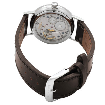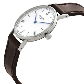 Silver-tone stainless steel case with a brown leather strap. Fixed silver-tone stainless steel bezel. White dial with blue hands and index-Roman numerals hour markers. Minute markers around the outer rim. Dial Type: Analog. Nomos Calibre Alpha.2 Hand Wind movement, containing 17 Jewels, bitting at 21600 vph, and has a power reserve of approximately 43 hours. Scratch resistant sapphire crystal. Pull / push crown. Transparent case back. Round case shape, case size: 32.8 mm, case thickness: 6.5 mm. Band width: 17 mm. Tang buckle clasp. Water resistant at 30 meters / 100 feet. Functions: hour, minute. Ludwig Series Series. Watch label: Made in Germany. Nomos Ludwig Series White Dial Ladies Watch 249.