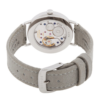 Silver-tone stainless steel case with a gray leather strap. Fixed silver-tone stainless steel bezel. Red dial with silver-tone hands and Arabic numeral hour markers. Dial Type: Analog. One subdial displaying: small seconds. Nomos Calibre Alpha Hand Wind movement, containing 17 Jewels, bitting at 21600 vph, and has a power reserve of approximately 43 hours. Scratch resistant sapphire crystal. Pull / push crown. Transparent see through case back. Round case shape, case size: 33 mm. Buckle clasp. Water resistant at 30 meters / 100 feet. Functions: hour, minute, second. Metro Series. Sport watch style. Watch label: Made in Germany. Nomos Metro Automatic Red Dial Unisex Watch 1123.