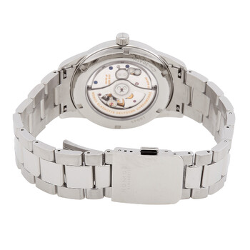 Silver-tone stainless steel case and bracelet. Fixed silver-tone stainless steel bezel. Light gray dial with silver-tone hands and index-Arabic numeral hour markers. Minute scale around the inner rim. Dial Type: Analog. Luminescent hands and markers. One-small seconds subdials. Nomos Calibre DUW 3001 Automatic movement, containing 27 Jewels, bitting at 21600 vph, and has a power reserve of approximately 42 hours. Scratch resistant sapphire crystal. Transparent see through case back. Round case shape, case size: 39.5 mm, case thickness: 8.5 mm. Band width: 20 mm. Deployment with push button release clasp. Water resistant at 20 meters / 65 feet. Functions: hour, minute, second. Dress watch style. Watch label: Made in Germany. Nomos Automatic Unisex Watch 764.
