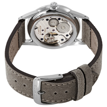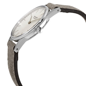 Stainless steel case with a beige leather strap. Fixed stainless steel bezel. White dial with gold-tone hands and index hour markers. Minute markers around the outer rim. Dial Type: Analog. Nomos calibre Alpha.2 hand wind movement, containing 17 Jewels, bitting at 21600 vph, and has a power reserve of approximately 43 hours. Scratch resistant sapphire crystal. Pull / push crown. Transparent case back. Round case shape. Case size: 32.8 mm. Case thickness: 7.6 mm. Band width: 17 mm. Tang clasp. Water resistant at 30 meters / 100 feet. Functions: hour, minute. Orion 33 Duo Series. Casual watch style. Watch label: Made In Germany. Nomos Orion 33 Duo Hand Wind White Dial Watch 320.