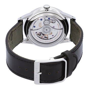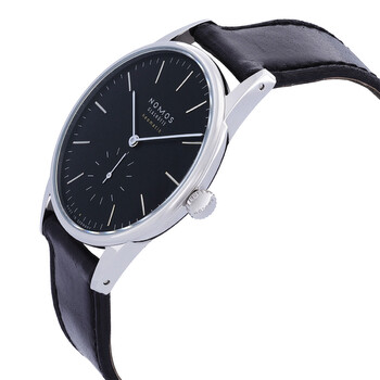 Silver-tone stainless steel case with a black leather strap. Fixed silver-tone stainless steel bezel. Black dial with silver-tone hands and index hour markers. Dial Type: Analog. One-small second subdials. Nomos Calibre DUW 3001 Automatic movement, containing 27 Jewels, bitting at 21600 vph, and has a power reserve of approximately 42 hours. Scratch resistant sapphire crystal. Pull / push crown. Transparent see through case back. Round case shape, case size: 38.5 mm, case thickness: 8.7 mm. Band width: 19 mm. Winged clasp. Water resistant at 50 meters / 165 feet. Functions: hour, minute, small second. Dress watch style. Watch label: Made in Germany. Nomos Automatic Black Dial Men's Watch 346.