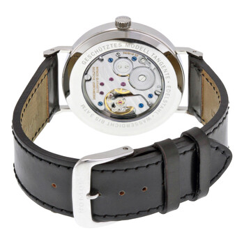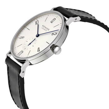 Stainless steel case with a black leather strap. Fixed stainless steel bezel. Galvanized white silver-plated dial with blued steel stick-style hands and alternating Arabic numeral and index hour markers. Minute markers around the outer rim. Dial Type: Analog. Date display at the 6 o'clock position. Small seconds sub-dial. Nomos caliber DUW 4101 hand wind movement with a 42-hour power reserve. Scratch resistant sapphire crystal. Pull / push crown. Transparent case back. Round case shape. Case size: 37.5 mm. Case thickness: 6.75 mm. Band width: 19 mm. Tang clasp. Water resistant at 30 meters / 100 feet. Functions: date, hour, minute, second. Additional Info: leather strap is made of shell cordovan. Casual watch style. Watch label: Made in Germany. Nomos Tangente 38 Datum Leather Men's Watch 130.