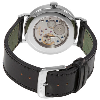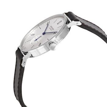 Stainless steel case with a black (horween shell) leather strap. Fixed stainless steel bezel. Galvanized, white silver-plated dial with blue stick-style hands and alternating Arabic numeral and index hour markers. Minute markers around the outer rim. Dial Type: Analog. Small seconds sub-dial. Nomos calibre Alpha hand wind movement with a 43-hour power reserve. Scratch resistant sapphire crystal. Transparent case back. Round case shape. Case size: 37.5 mm. Case thickness: 6.75 mm. Band width: 19 mm. Tang clasp. Water resistant at 30 meters / 100 feet. Functions: hour, minute, second. Additional Info: leather strap is made of shell cordovan. Casual watch style. Watch label: Made in Germany. Nomos Tangente 38 Galvanized White Silver-plated Dial Men's Watch 164.