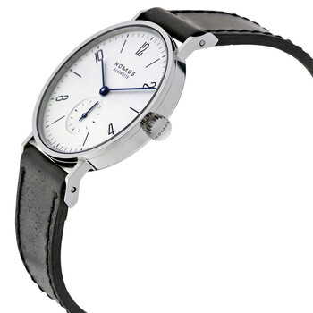 Stainless steel case with a black leather strap. Fixed stainless steel bezel. Galvanized white silver-plated dial with blued steel hands and alternating Arabic numeral and index hour markers. Minute markers around the outer rim. Dial Type: Analog. Small seconds sub-dial above the 6 o'clock position. Caliber Alpha hand wind movement with a 43-hour power reserve. Scratch resistant sapphire crystal. Transparent case back. Case size: 35 mm. Case thickness: 6.2 mm. Round case shape. Band width: 18 mm. Tang clasp. Water resistant at 30 meters / 100 feet. Functions: hour, minute, second. Additional Info: leather strap is made of shell cordovan. Casual watch style. Watch label: Made in Germany. Nomos Tangente Galvanized White Dial Leather Unisex Watch 139.