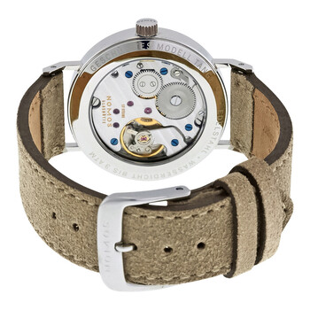 Stainless steel case with a beige (velour) leather strap. Fixed stainless steel bezel. Galvanized white silver dial with blued steel hands and alternating index and Arabic numeral hour markers. Minute markers around the outer rim. Dial Type: Analog. Small seconds sub-dial. Nomos calibre Alpha hand wind movement with a 43-hour power reserve. Scratch resistant sapphire crystal. Pull / push crown. Transparent case back. Round case shape. Case size: 32.8 mm. Case thickness: 6.55 mm. Band width: 17 mm. Tang clasp. Water resistant at 30 meters / 100 feet. Functions: hour, minute, second. Casual watch style. Watch label: Made in Germany. Nomos Tangente Hand Wind White Silver Dial Ladies Watch 123.
