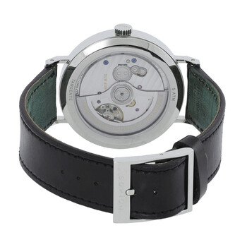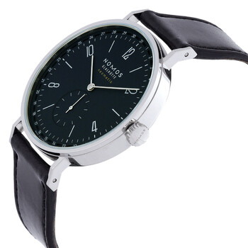Silver-tone stainless steel case with a black leather strap. Fixed bezel. Midnight blue dial with rhodium-plated hands and index-Arabic numerals hour markers. Dial Type: Analog. Pointer date. One subdial displaying: one- small seconds. Caliber DUW 6101 automatic movement. Scratch resistant sapphire crystal. Pull / push crown. Transparent case back. Round case shape, case size: 40.5 mm, case thickness: 7.8 mm. Band width: 20 mm. Tang buckle clasp. Water resistant at 50 meters / 164 feet. Functions: date, hour, minute, second. Tangente Series. Luxury watch style. Watch label: Made in Germany. Nomos Tangente Midnight Blue Dial Automatic Men's Watch 182.