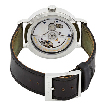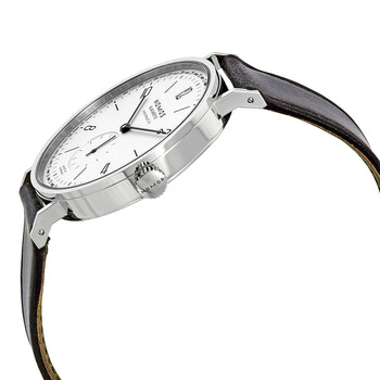 Stainless steel case with a black (horween shell) leather strap. Fixed stainless steel bezel. Galvanized white silver-plated dial with black hands and alternating Arabic numeral and index hour markers. Minute markers. Date scale around the outer rim. Dial Type: Analog. Small second sub-dial. Nomos calibre DUW 6101 automatic movement with a 42-hour power reserve. Scratch resistant sapphire crystal. Pull / push crown. Transparent case back. Round case shape. Case size: 40.5 mm. Case thickness: 7.9 mm. Band width: 20 mm. Tang clasp. Water resistant at 50 meters / 165 feet. Functions: date, hour, minute, small second. Luxury watch style. Watch label: Made in Germany. Nomos Tangente Neomatik Automatic White Dial Men's Watch 180.