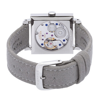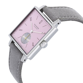 Silver-tone stainless steel case with a gray leather strap. Fixed silver-tone stainless steel bezel. Pink dial with silver-tone hands and index-Arabic numeral hour markers. Minute markers around the outer rim. Dial Type: Analog. One-small seconds sub-dial subdials. Aplha automatic movement with a 43-hour power reserve. Scratch resistant sapphire crystal. Pull / push crown. Transparent see through case back. Square case shape, case size: 29.5 mm, case thickness: 6.3 mm. Band width: 18 mm. Tang clasp. Water resistant at 30 meters / 100 feet. Functions: hour, minute, second. Tetra Series. Dress watch style. Watch label: Made in Germany. Nomos Tetra Automatic Pink Dial Ladies Watch 476.