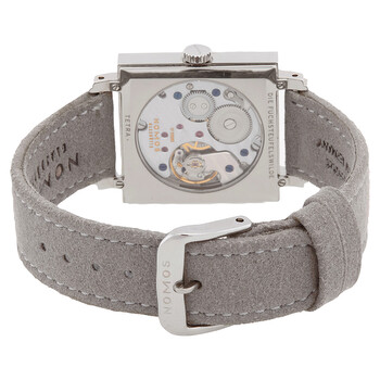Silver-tone stainless steel case with a gray leather strap. Fixed silver-tone stainless steel bezel. Aubergine/purple dial with silver-tone hands and index-Arabic numeral hour markers. Minute markers around the outer rim. Dial Type: Analog. One-small seconds sub-dial subdials. Alpha automatic movement with a 43-hour power reserve. Scratch resistant sapphire crystal. Pull / push crown. Transparent see through case back. Square case shape, case size: 29.5 mm, case thickness: 6.3 mm. Band width: 18 mm. Tang clasp. Water resistant at 30 meters / 100 feet. Functions: hour, minute, second. Tetra Series. Dress watch style. Watch label: Made in Germany. Nomos Tetra Automatic Men's Watch 475.