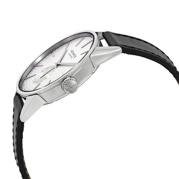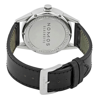 Stainless steel case with a black (horween genuine shell) leather strap. Fixed stainless steel bezel. White dial with silver-tone hands and index hour markers. Minute markers around the outer rim. Dial Type: Analog. Small seconds sub-dial. Nomos calibre Epsilon automatic movement, containing 26 Jewels, bitting at 21600 vph, and has a power reserve of approximately 43 hours. Scratch resistant sapphire crystal. Pull / push crown. Solid case back. Round case shape. Case size: 39.8 mm. Case thickness: 9.6 mm. Band width: 20 mm. Tang clasp. Water resistant at 30 meters / 100 feet. Functions: hour, minute, small second. Zurich Series. Luxury watch style. Watch label: Made in Germany. Nomos Zurich Automatic White Dial Men's Watch 806.