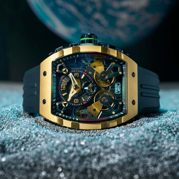 The Magellan Double Barrel Automatic is powered by a self-winding double barrel movement, showcasing the hour and minute display at the top of the dial and a subdial seconds display at the 6 o’clock position. The double barrels, positioned at 5 and 7 o’clock, add intricate mechanical detail, creating a watch that is as visually captivating as it is technically impressive. Black stainless steel case with a black rubber strap. Fixed yellow gold-tone stainless steel bezel. Gold-tone dial with yellow gold-tone hands and index hour markers. Minute markers around the outer rim. Dial Type: Analog. Luminescent hands and markers. M-PTS-S05A automatic movement. Scratch resistant mineral crystal. Screw down crown. Transparent case back. Tonneau case shape, case size: 48 mm, case thickness: 19 mm. Band width: 26 mm, band length: 8 inches. Water resistant at 50 meters / 165 feet. Functions: hour, minute, second. Magellan Series. Casual watch style. Nubeo Magellan Automatic Gold Dial Men's Watch NB-6100-05.