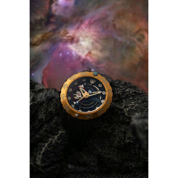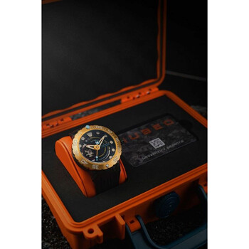 Introducing the new iteration of the Opportunity Automatic. Featuring the similar build of the original Opportunity with automatic movement and a 48mm case, this exquisite timepiece carries a dial made from carbon fibre, which gives a unique and mesmerizing look. Only 500 pieces are available. Black composite case with a black silicone strap. Uni-directional rotating yellow gold-tone stainless steel bezel. Black dial with yellow gold-tone hands and index hour markers. Dial Type: Analog. Luminescent hands and markers. Seiko - NH38 automatic movement. Scratch resistant sapphire crystal. Screw down crown. Transparent case back. Round case shape, case size: 48 mm, case thickness: 17.9 mm. Band width: 20 mm, band length: 8 inches. Water resistant at 300 meters / 1000 feet. Functions: hour, minute, second. Opportunity Series. Casual watch style. Nubeo Opportunity Black Dial Men's Watch NB-6085-01.